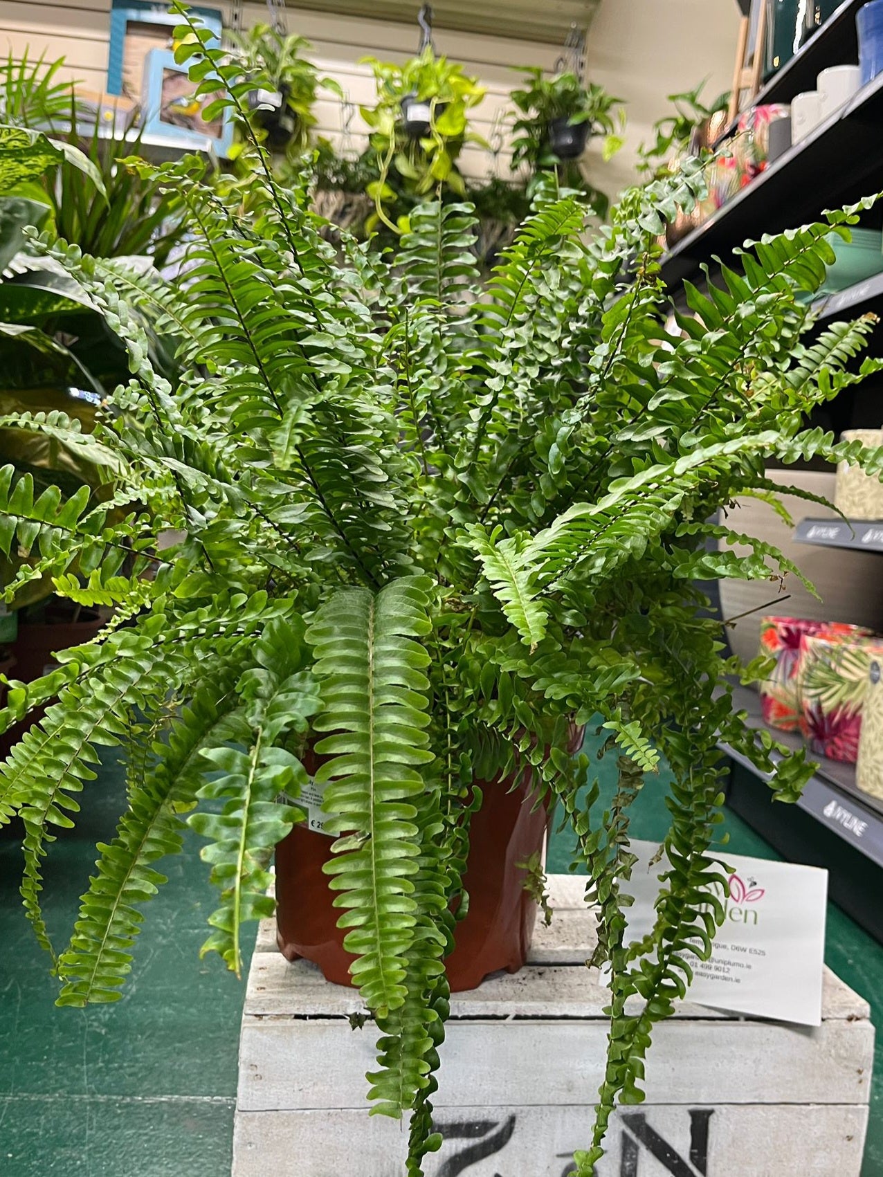Nephrolepsis exal. or Boston-fern, look wonderful when hung in a steamy bathroom or bright kitchen, where they will thrive in the humid atmosphere. Their upright to gently arching fronds create a spectacular fountain-like clump, with a distinctly tropical feel. Keep the compost moist (but not waterlogged) at all times, but this can be cut back a little in winter, and place in a bright spot away from direct sunlight. These ferns love a humid atmosphere, so mist the leaves regularly with water.