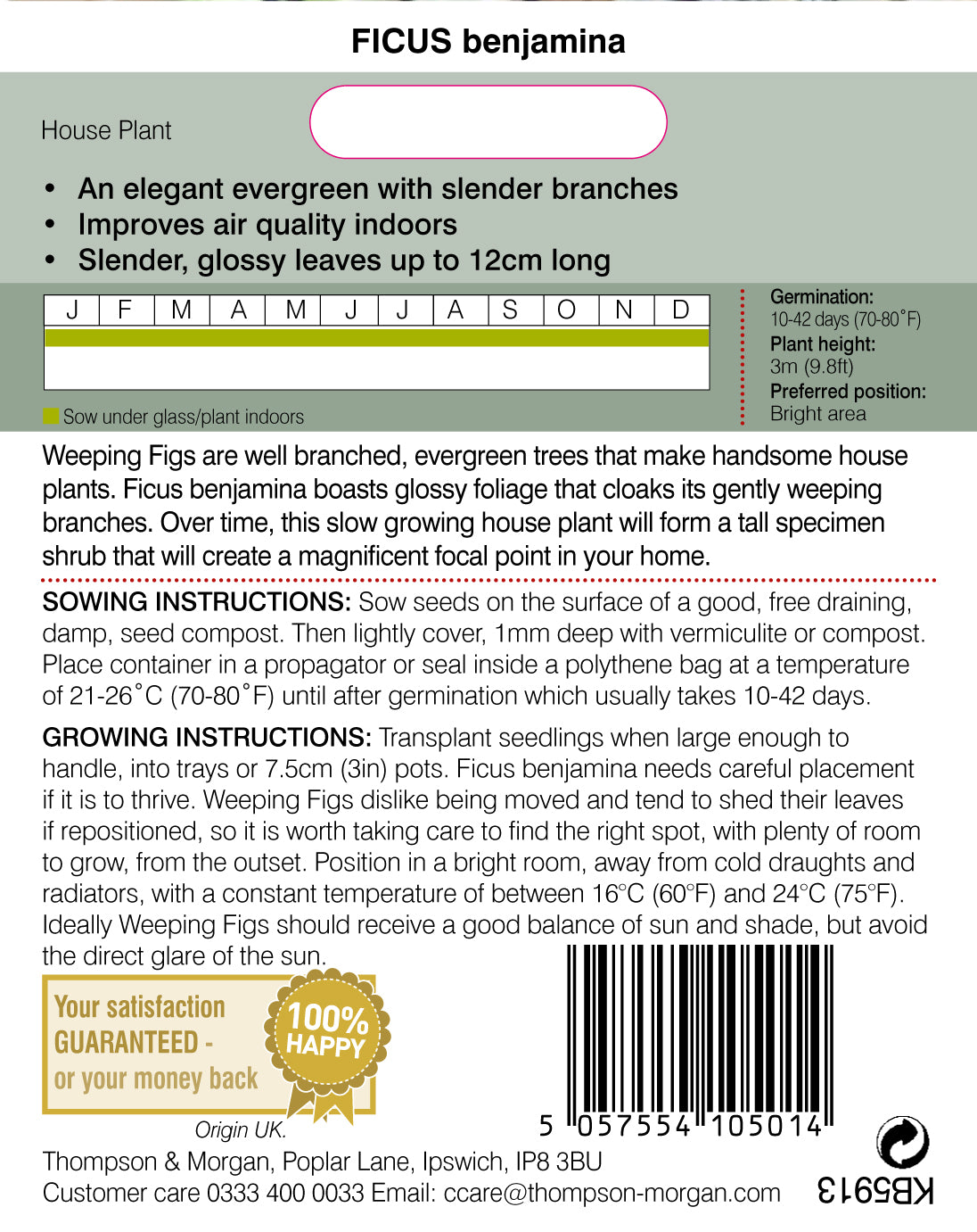 Transplant seedlings when large enough to handle, into trays or 7.5cm (3in) pots. Ficus benjamina needs careful placement if it is to thrive. Weeping Figs dislike being moved and tend to shed their leaves if repositioned, so it is worth taking care to find the right spot, with plenty of room to grow, from the outset. Position in a bright room, away from cold draughts and radiators, with a constant temperature of between 16°C (60°F) and 24°C (75°F). Ideally Weeping Figs should receive a good balance of sun and shade, but avoid the direct glare of the sun.